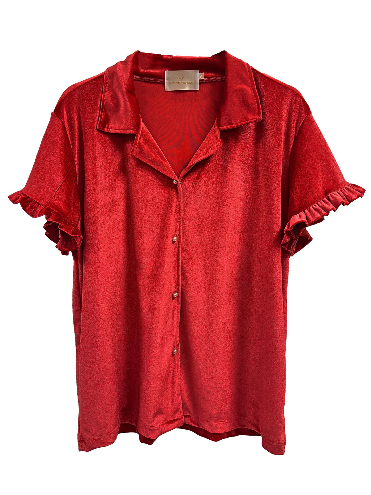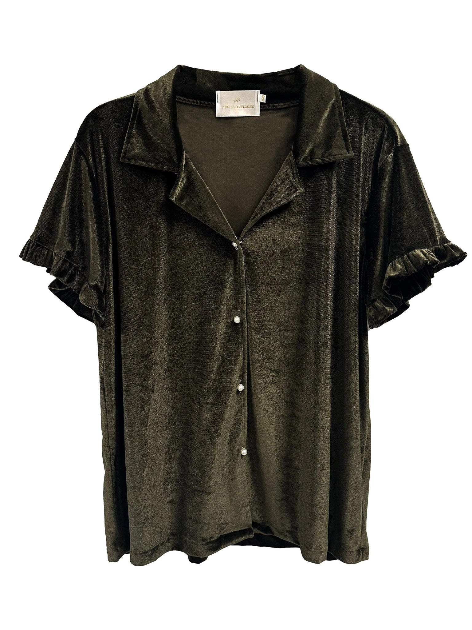 New! Say hello to Chloe: our must-have collection of lush & vibrant velvets. Stay Cozy in our best-selling Chloe Velvet Short Sleeve Top. Featuring pearl buttons and our staple ruffle detailing!